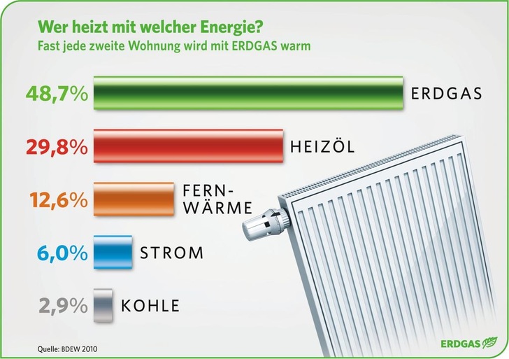 In Deutschland werden gemäß Zahlen des Bundesverbandes der Energie- und Wasserwirtschaft in 18,6 Millionen Wohnungen mit Erdgas beheizt. Das entspricht einem Anteil von 48,7 Prozent am Wohnungsbestand. Der Einsatz von Heizöl ist mit 29,8 Prozent leicht zuruckgegangen, Fernwärme stieg geringfugig auf einen Anteil von 12,6 Prozent. Der Anteil der Stromheizungen blieb mit 6,0 Prozent auf konstantem Niveau. Kohleheizungen gingen mit 2,9 Prozent weiter leicht zuruck. Gegenuber 1999 stieg der Anteil erdgasbeheizter Wohnungen um 5,3 Prozent, wohingegen der Anteil von Heizöl um 3,1 Prozent und der von Kohle um 2,5 zuruckging.