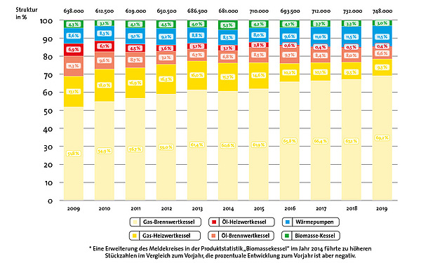 Im vergangenen Jahr legte der Heizungsmarkt mit plus 2 % nur schwach zu. Fast 80 % der 2019 verkauften Heizungen sind erdgasbasiert. Mit großem Abstand am stärksten nachgefragte Technologie war mit 518 000 abgesetzten Geräten und einem Plus von 5 % moderne Gas-Brennwerttechnik. Platz 2 der Absatz-Statistik belegte, wie schon in 2018, mit 86 000 verkauften Geräten die Wärmepumpe – allerdings bei gedrosseltem Wachstum von 2 % (2018: plus 8 %). Der Absatz von Ölheizungen ging um 17 % zurück. Die Nachfrage nach Biomasse-Kesseln schwächte sich ebenfalls leicht ab (minus 1 %).