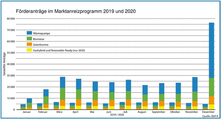 Nach Angaben des Bundesamts für Wirtschaft und Ausfuhrkontrolle (BAFA) ist von Januar bis Dezember für rund 334 000 Wärmeerzeuger eine Förderung beantragt worden. Im Vorjahreszeitraum waren es 67 600. Im Dezember 2020 gab es einen Boom mit 69 000 Anträgen für insgesamt 76 600 Wärmeerzeuger.