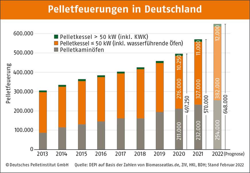 Der Zubau an Pelletfeuerungen in Deutschland erfolgte im Jahr 2021 mit einer bislang nicht bekannten Dynamik. 86.500 neue Feuerungen wurden installiert. Im Vorjahr waren es 61.850 (plus 40 %). Über 61.000 dieser Anlagen sind Pelletzentralheizungen und wasserführende Pelletkaminöfen bis zu einer Leistung von 50 Kilowatt (kW), die vor allem zum Ersatz von Ölheizungen in Ein- und Zweifamilienhäusern eingesetzt werden. Gefolgt werden sie von 24.000 luftgeführten Pelletkaminöfen und knapp 1200 größeren Heizkesseln/KWK-Anlagen (> 50 kW). Letztere werden für Wärmenetze oder auch für Prozesswärme in Gewerbe und Industrie genutzt.