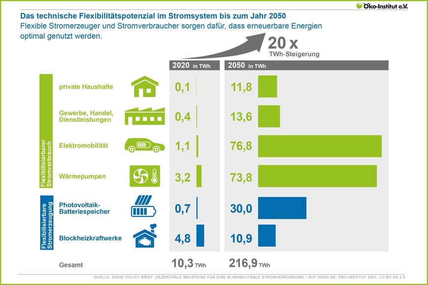 Im Jahr 2020 lag das technische Flexibilitätspotenzial dezentraler Erzeuger und Verbraucher bei rund 10 TWh (10 Mrd. kWh). Das waren knapp 2 % des Stromverbrauchs (558 TWh). Bis zum Jahr 2050 kann sich die flexibilisierbare Strommenge auf rund 220 TWh verzwanzigfachen. Das Prinzip ist relativ einfach: