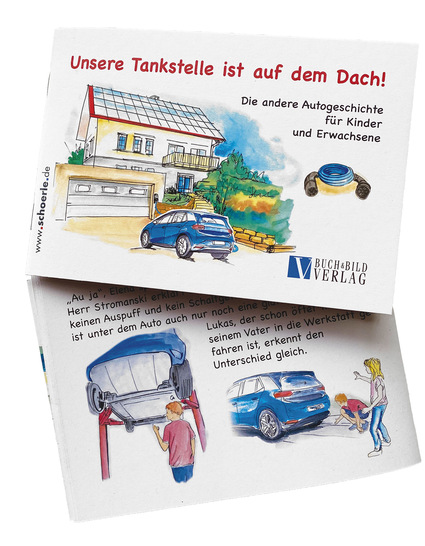 Wer hätte nicht gerne eine eigene Tankstelle und Treibstoff im Überfluss? Was spätestens seit 1973 und verursacht durch die Ölkrise, ein Traum vieler Autofahrer war, ist Wirklichkeit geworden. Wie, das beschreibt Autor und Illustrator Hajo Schörle in seinem neuen Vorlesebuch „Unsere Tankstelle ist auf dem Dach! Die andere Autogeschichte für Kinder und Erwachsene“. Auf 32 liebevoll gestalteten Druckseiten schildert Schörle, wie Strom von der Photovoltaikanlage auf dem Dach ins Elektroauto gelangt. Dank seiner bildhaften Sprache versetzt er selbst kleinste Zuhörer in die Lage, komplexe Sachverhalte und entsprechende Zusammenhänge zu verstehen. In Kombination mit seinen handgemalten Illustrationen zeigt Schörle auf, wie nachhaltig erzeugte Energie ein Elektrofahrzeug antreibt und seine Insassen von A nach B transportiert. Selbstverständlich dürfen dabei auch die Beschreibung von Ladevorgängen sowie der Vergleich zwischen Elektro- und Verbrennungsmotoren nicht fehlen.