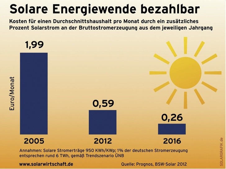 Die Prognos AG analysierte auch die Nachbesserungen, die der Bundesrat bei der jüngsten Novelle des Erneuerbare-Energien-Gesetzes durchgesetzt hat. Sie erhöhen die Stromrechnung eines Durchschnittshaushaltes in den nächsten vier Jahren um lediglich 0,5 %. Andererseits sinken die Kosten für den weiteren Ausbau der Photovoltaik rapide. Die Umstellung von einem Prozent des herkömmlichen Strommixes auf Solarstrom hätte im Jahr 2005 einen Durchschnittshaushalt noch rund 2 Euro im Monat gekostet. In diesem Jahr zahlen Verbraucher für jeden weiteren Prozentpunkt Solarstrom nur noch etwa 60 Cent pro Monat. „Es gibt keinen nachvollziehbaren Grund, den Ausbau von Solarstrom durch überzogene Einschnitte bei der Solarstromförderung zu drosseln und damit die Existenz von hunderten Solarunternehmen aufs Spiel zu setzen“, sagte Körnig.