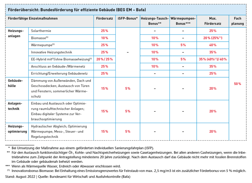 Um mit dem bestehenden Fördertopf mehr Projekte zu unterstützen, wurden die Fördersätze bei allen Einzelmaßnahmen gekürzt. Auffällig ist, dass im Heizungsbereich die Biomasse seit dem 15. August 2022 nur noch mit max. 20 % bezuschusst wird statt wie früher mit max. 55 %. Vermutlich will das BMWK die bislang starke BEG-Fördernachfrage abbremsen. Immerhin: Bei Einhaltung eines Emissionsgrenzwertes für Feinstaub von max. 2,5 mg/m3 ist ein zusätzlicher Förderbonus von 5 % möglich.