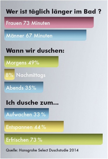 Im Schnitt duscht der Deutsche 11 Minuten, damit liegt er auf dem zweiten Platz der Schnellduscher hinter den Franzosen mit 10 Minuten. Der Morgen ist in Deutschland die beliebteste Zeit zum Duschen: 49 % sind Frühduscher, 8 % duschen nachmittags und 35 % am Abend. 25- bis 34-Jährige duschen weltweit am häufigsten, Männer brauchen im Schnitt 12 Minuten und 40 Sekunden, Frauen 13 Minuten und 16 Sekunden. Auch bei der gesamten täglichen Aufenthaltsdauer im Bad gibt es nur einen Unterschied von sechs Minuten zwischen den Geschlechtern (Frauen 73, Männer 67 Minuten).