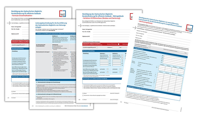 Die offiziellen VdZ-Nachweisformulare zur Bestätigung eines durchgeführten hydraulischen Abgleichs wurden an die neue Bundesförderung für energieeffiziente Gebäude (BEG) angepasst. Die Aktualisierung der drei bestehenden Formulare wurde gemeinsam mit KfW und Bafa vorgenommen. Die Nutzung der VdZ-Formulare ist verbindlich zum Nachweis eines hydraulischen Abgleichs. Durchgeführte hydraulische Abgleiche sollten künftig ausschließlich durch die an die BEG angepassten Nachweisformulare vom Fachhandwerker bestätigt werden.