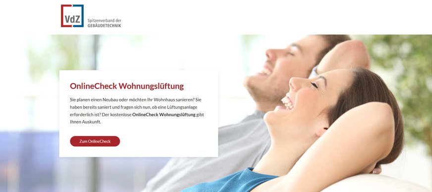 Der OnlineCheck Wohnungslüftung ist ein Angebot der VdZ. Es wurde in Zusammenarbeit mit dem BDH – Bundesverband der Deutschen Heizungsindustrie, der HEA – Fachgemeinschaft für effiziente Energieanwendung e.V., dem VfW – Bundesverband für Wohnungslüftung und dem ZVSHK – Zentralverband Sanitär Heizung Klima erarbeitet.