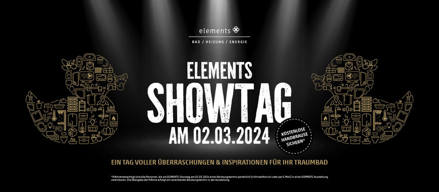 Am bundesweiten Elements Showtag am 2. März 2024 erleben Besucher ein vielfältiges Spektrum an inspirierenden Themen rund ums Bad: Von der Teilsanierung, über schöne barrierefreie Bäder mit bodengleicher Dusche bis zu gesundheitsfördernden Wellness-Lösungen wie der Sonnendusche von Sunshower. Kunden eines Fachhandwerkers, die am Elements Showtag einen Beratungstermin vereinbaren, erhalten am Tag Ihrer Badberatung eine hochwertige Handbrause als Willkommensgeschenk.