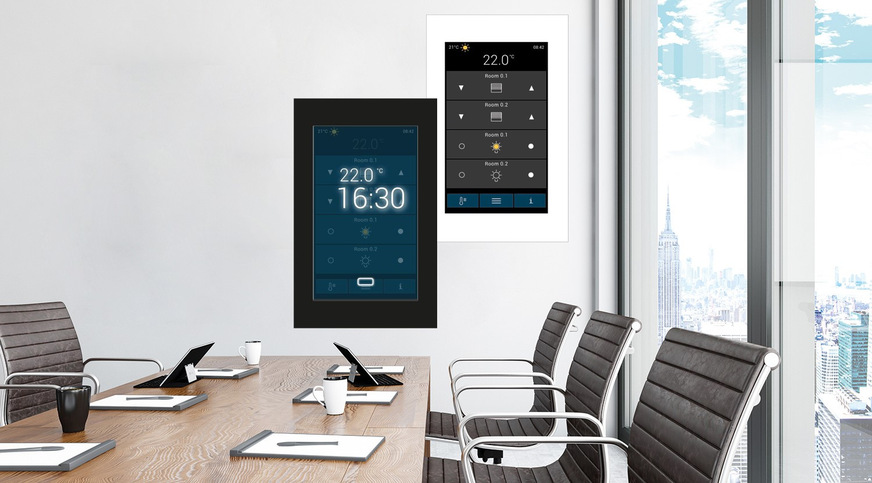 Neuberger, 12.0-C02: Das Raumbediengerät RP8100 mit kapazitivem 5″-Touchdisplay kann vertikal und horizontal betrieben werden. Integrierte Sensoren für Temperatur, Feuchte, Helligkeit, Präsenz, VOC und CO2 ermöglichen eine Einbindung von Regelfunktionalitäten. Wird das mit integriertem Webserver ausgestattete Panel via BACnet/IP an die GLT angebunden, können die Regelung und Visualisierung autark über das Gerät erfolgen.