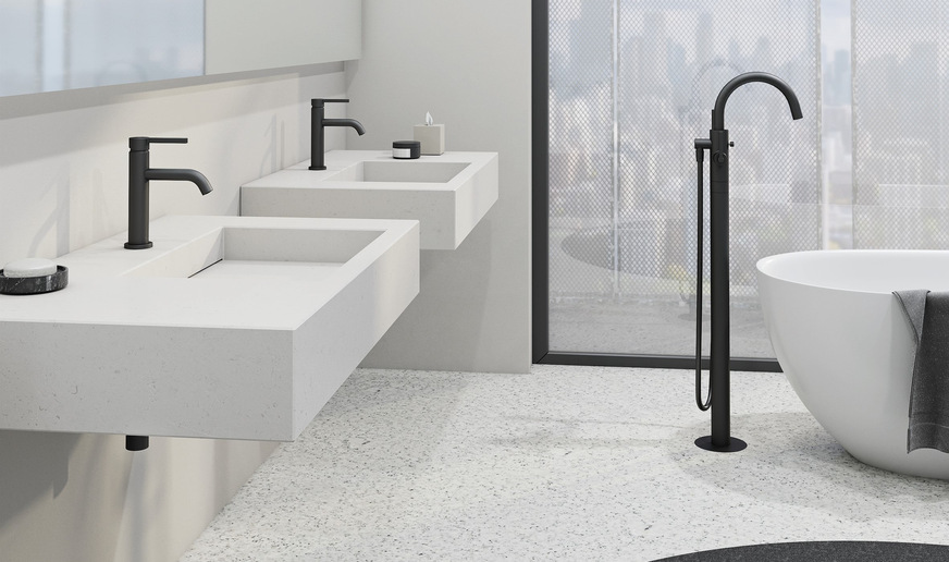 Kludi, 3.1-D11, erweitert die Badarmaturenserie Nova Fonte. Das Programm mit den Stilrichtungen Classic, Puristic und Déco wächst um eine frei stehende Wannenarmatur mit Handbrause, einen Vier-Loch-Wannenrandmischer mit Handbrause und eine Standarmatur für das Bidet. Die Ergänzungen sind in der Puristic-Designausprägung neben Chrom auch in Mattschwarz erhältlich.