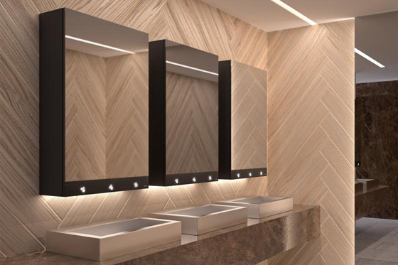 Delabie, 4.1-C06: zeigt Neuheiten wie die neue Waschplatz-Spiegelkombination 4 in 1 (Bild) für den öffentlichen Bereich. Diese vereint Spiegel, elektronischen Seifenspender, elektronisches Ventil und Händetrockner in zeitlosem Design. Die Montage ist schnell und einfach. Leuchtpiktogramme gewährleisten eine intuitive Nutzung, die berührungslose Funktionsweise ist hygienisch und komfortabel. Neu im Gesundheitsbereich ist die sequentielle Brause-Thermostatarmatur für Unterputzmontage H9633. Sie bietet Patienten Sicherheit, beugt nosokomialen Infektionen vor und erhöht den allgemeinen Komfort in Gesundheitseinrichtungen.