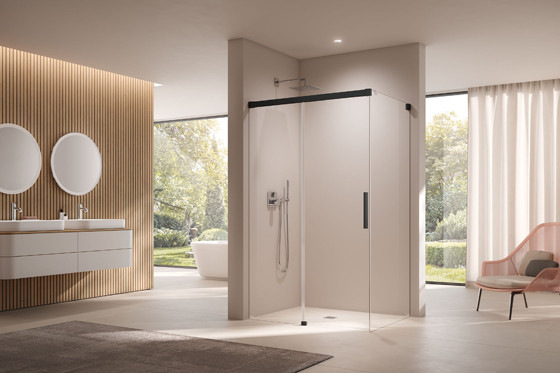 Kermi, 3.1-A69: präsentiert an seinem Duschdesign-Stand die Beschlag-Duschkabine Mena und die Gleittür Nica (Bild) ohne Wandprofil.