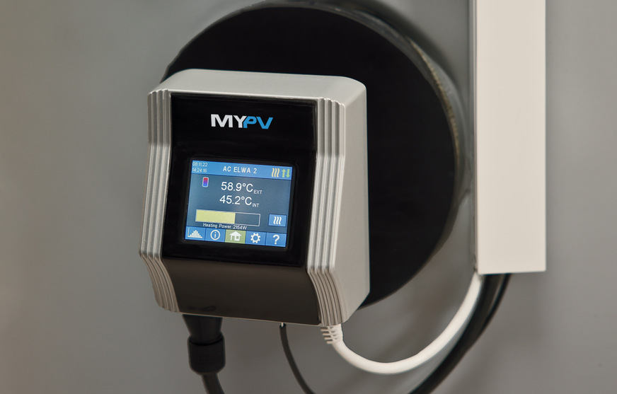 my-PV, 12.1-B61: Der solarelektrische Heizstab AC Elwa 2 kann durch eine Trennung von Heizelement und Elektronikeinheit ohne Abstimmung mit dem Elektrogewerk eingebaut werden. Er ist bis 3,5 kW stufenlos regelbar und kann zudem einen Standardheizstab bis 3 kW ansteuern.