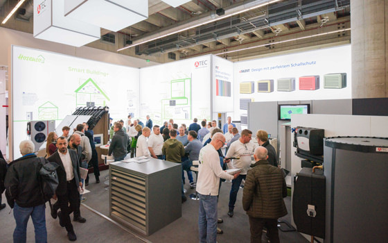 Atec, 3D21: Die Luft/Wasser-Wärmepumpe eHEAT R290-61 mit 61 kW Leistung und natürlichem Kältemittel zählt zu den leisesten ihrer Klasse und eignet sich besonders für den innerstädtischen Gebäudebestand. Die Schallschutzserie eSILENT reduziert den Geräuschpegel von Großgeräten um bis zu 25 dB(A) und lässt sich dank modularem Design flexibel bei Sanierung und Nachrüstung in dicht bebauten Wohngebieten einsetzen.