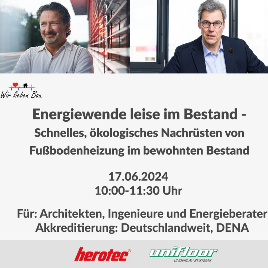 Herotec veranstaltet am 17. Juni 2024 gemeinsam mit Industriepartner Unifloor auf der Online-Plattform wirliebenbau.de ein Webinar zum schnellen, ökologischen Nachrüsten von Fußbodenheizung im bewohnten Bestand.