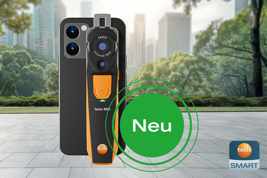 Die neue Testo 860i ist eine kompakte Wärmebildkamera für Smartphones für schnelle und präzise Spot-Checks. Temperaturdifferenzen, Hotspots und Feuchtigkeit lassen sich direkt im Wärmebild bestimmen. Zusammen mit der App bietet die Kamera viele praxisorientierte Messprogramme.