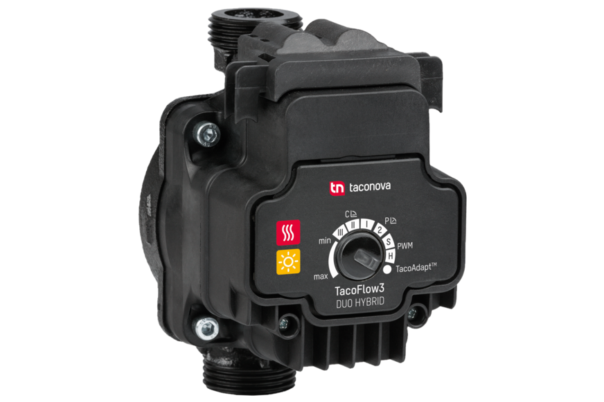 Taconova erweitert die TacoFlow3-Pumpenreihe mit der TacoFlow3 Duo Hybrid, einer kompakten Umwälzpumpe für Heiz- und Solaranlagen. Die Pumpe erreicht eine Förderhöhe von bis zu 8,5 m und ist für interne, externe oder hybride Steuerung ausgelegt. Sie bietet Betriebsarten wie Min-Max, Proportionaldruck und Konstantdruck sowie die Funktionen TacoAdapt und PWM.