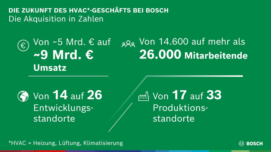 Bosch will das HLK-Geschäft für Wohn- und kleine Gewerbegebäude von Johnson Controls und Hitachi erwerben. Der Umsatz der Bosch Home Comfort Group wird dann von 5 Mrd. Euro auf 9 Mrd. Euro wachsen.