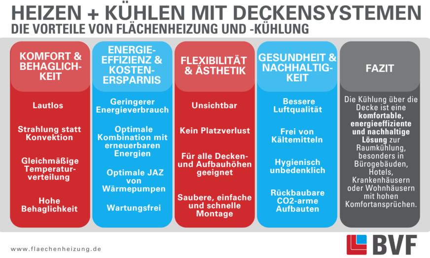 Beide Verlegvarianten zeichnen sich aus durch niedrige Systemtemperaturen im Heizfall sowie relativ hohe Kühlwassertemperaturen im Sommerbetrieb und sorgen bei Einbindung regenerativer Energieerzeuger für die Steigerung des Wirkungsgrades.