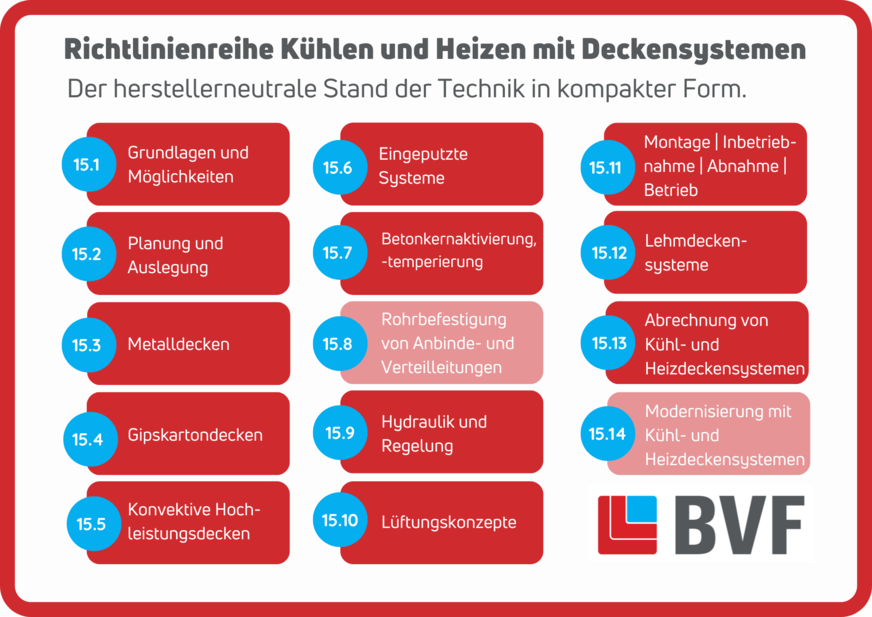 Bereits seit einigen Jahren haben die BVF-Deckenrichtlinien den Status einer allgemein anerkannten Regel der Technik. Nun hat der BVF speziell für die Thermische Bauteilaktivierung über die Decke ein weiteres umfassendes Dokument erstellt, da das Thema Speicherung von Wärme und Kälte immer wichtiger wird.