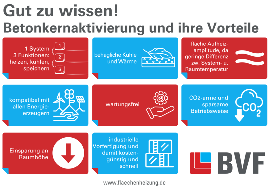 Der Bundesverband Flächenheizungen und Flächenkühlungen e.V. (BVF) gibt mit der Richtlinie 15.7 „Betonkern- und oberflächennahe thermische Aktivierung“ ein herstellerneutrales und technologieübergreifendes Basiswerk heraus. Für welche Bauten eignet sich diese Form und welche Aspekte müssen beachtet werden?