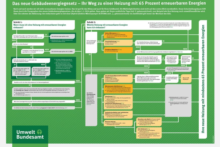 Eine Heizung auf erneuerbare Energien umzustellen, verlangt allen Beteiligten von der Entscheidungsfindung über die Planung bis zur Installation einiges ab. Der Weg zur neuen Heizung mit erneuerbaren Energien ist jedoch machbar und lohnt sich, besonders bei einer Inanspruchnahme von Fördermitteln. Eine UBA-Infografik des Umweltbundesamts ordnet die seit 2024 geltenden Regelungen im Gebäudeenergiegesetz für den Einbau einer neuen Heizung zu einem Entscheidungsbaum.