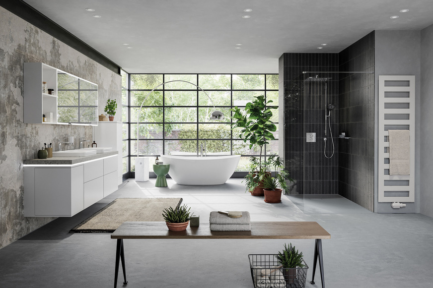 Neue Fronten für Badezimmermöbel sorgen für ein modernes und hochwertiges Erscheinungsbild. Farbvarianten wie Salbei, Sand oder Perlgrau bieten zusätzliche Gestaltungsmöglichkeiten. Besonderes Augenmerk gilt dem Stauraumkonzept Vigour Turniture: Durch einen speziellen Drehmechanismus verwandelt sich der geschlossene Möbelkorpus per Fingertipp in ein offenes Regal. Dabei bleibt der Platzbedarf unverändert, und es wird keine Schwenktür benötigt. Die Bewegung erfolgt sanft, leise und präzise.