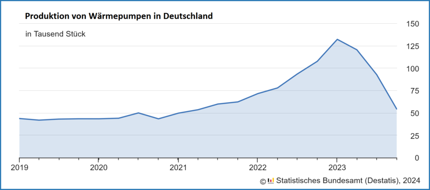 Im 4. Quartal 2023 wurden rund 54 400 Wärmepumpen in Deutschland produziert. Das waren 41,4 % weniger als im Vorquartal, als noch 92 900 Wärmepumpen hergestellt wurden, und etwa halb so viele (− 49,5 %) wie im Vorjahresquartal mit 107 700 Wärmepumpen. Weniger Wärmepumpen wurden zuletzt im 2. Quartal 2021 mit damals 53 600 produziert.