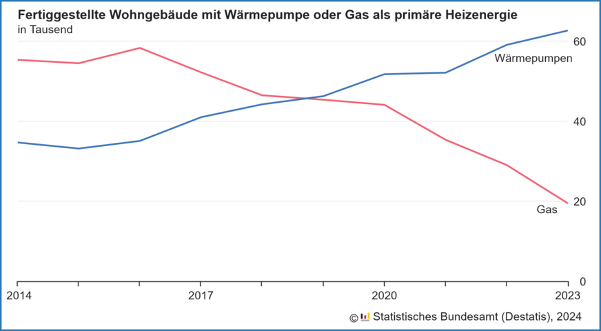 Heizungs-Wärmepumpen nutzen überwiegend Umweltthermie (Außenluft und Wasser) sowie die oberflächennahe Geothermie als erneuerbare Energiequellen. Inzwischen wird ein Großteil der neu errichteten Wohngebäude hierzulande überwiegend mit erneuerbaren Energien beheizt: In 69,3 % der 2023 fertiggestellten Wohngebäude waren erneuerbare die primäre Energiequelle für das Heizen. 2014 lag der Anteil noch bei 38,5 %.
