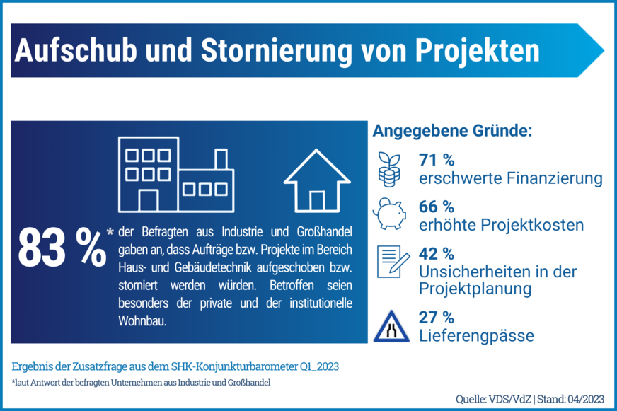 Laut den Befragungen für die SHK-Konjunktur im 1. Quartal 2023 ist das Volumen an aufgeschobenen oder stornierten Projekten im SHK-Bereich Anfang 2023 massiv gestiegen. Industrie und Großhandel prognostizieren eine Aufschub- und Stornierungsquote bei Bauprojekten von über 80 %.