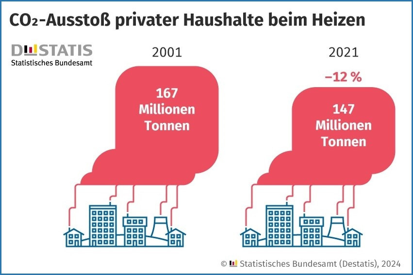 Für den Blick nach vorne hilft oft der Blick zurück: Die gesamten CO2-Emissionen privater Haushalte beim Heizen sind binnen 20 Jahren nur um 12 % gesunken. Nach Angaben des Statistischen Bundesamts sind im Jahr 2021 knapp 147 Mio. t CO2 emittiert worden, um Wohnräume warm zu halten. 2001 waren es knapp 167 Mio. t CO2.