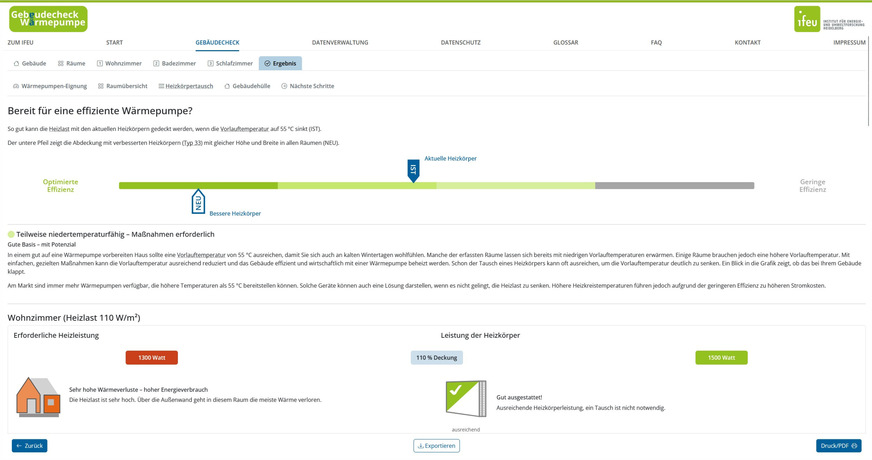 Mit einer Datenaufnahme zu Gebäude und Räumen, die sich potenziell schlecht beheizen lassen, ermittelt das Online-Tool, ob sich das Haus auch mit einer Wärmepumpe effizient heizen lässt. So lässt sich abschätzen, ob das Gebäude bereits geeignet ist, ein kostengünstiger Austausch von von einzelnen Heizkörpern ausreicht oder zunächst energetische Sanierungsmaßnahmen die Heizlast verringern sollten.