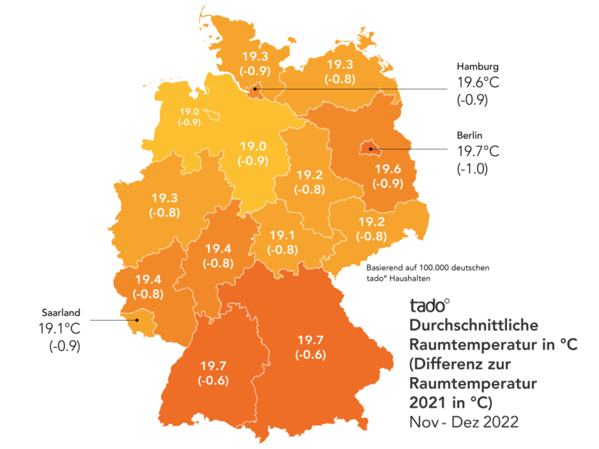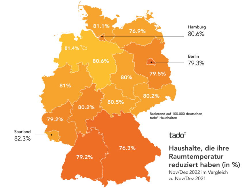 Auch regional konnte tado° Unterschiede in den mit tado°-Systemen ausgestatteten Haushalten feststellen: Während im Saarland die meisten Haushalte ihre Temperatur herunterdrehen (82,3 %), taten dies in Bayern nur 76,3 % der Haushalte. Berliner Haushalte waren im Schnitt im November und Dezember 2022 mit 19,8 °C am wärmsten, während die kälteste durchschnittliche Innenraumtemperatur in Bremen gemessen wurde (19,0 °C). Allerdings wurden in Berlin die Temperaturen im Vergleich zum Vorjahr am meisten abgesenkt (− 0,9 °C), während in Baden-Württemberg mit nur 0,6 °C die Raumtemperatur am wenigsten reduziert worden ist.