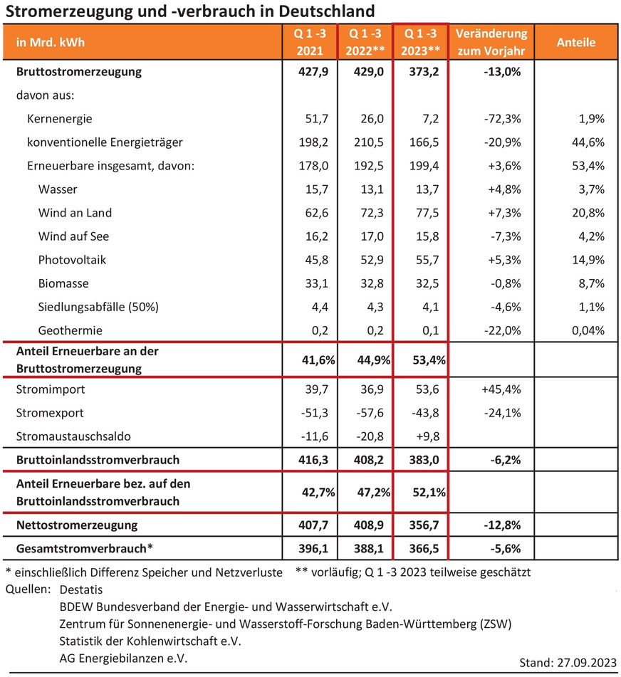 In den ersten drei Quartalen 2023 lag die Bruttostromerzeugung nach vorläufigen Berechnungen bei 373 TWh und damit 13 5 niedriger als im Vorjahreszeitraum (Quartal 1-3 2022: 429 TWh). Insgesamt wurden gut 199 TWh Strom aus Sonne, Wind und anderen regenerativen Quellen erzeugt (Quartal 1-3 2022: 192,5 TWh). Davon stammten