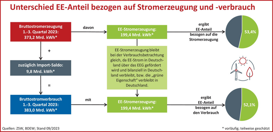 Der Anteil Erneuerbarer Energien am Bruttostromverbrauch in den ersten drei Quartalen 2023 beträgt rund 52 %. Den Ökostromanteil am Bruttostromverbrauch zu bemessen, ist die gängige Berechnungsgrundlage. Sie geht zurück auf europäische Vorgaben und steht im Einklang mit den Zieldefinitionen der Bundesregierung zum Ausbau der erneuerbaren Energien. Der Bruttostromverbrauch bildet das gesamte Stromsystem eines Landes ab.