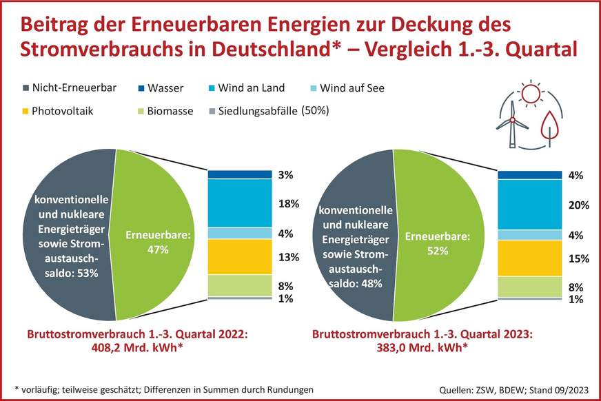 Erneuerbare Energien haben in den ersten drei Quartalen 2023 rund 52 % des Bruttostromverbrauchs gedeckt. Fast 5 Prozentpunkte mehr als im Vorjahreszeitraum. Das zeigen vorläufige Berechnungen des Zentrums für Sonnenenergie- und Wasserstoff-Forschung Baden-Württemberg (ZSW) und des Bundesverbands der Energie- und Wasserwirtschaft (BDEW).