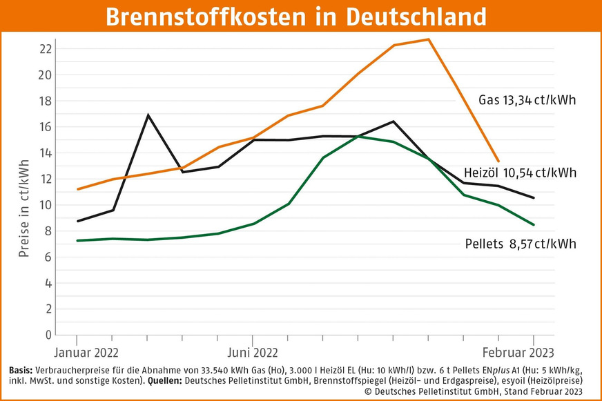 Der Preis für eine Kilowattstunde Wärme aus Pellets beträgt im Februar 2023 8,57 Ct/kWh. Damit bleibt der Preisvorteil zu Heizöl von knapp 19 % und zu Erdgas von gut 30 % auf einem hohen Niveau (Vergleichsbasis siehe Grafik).