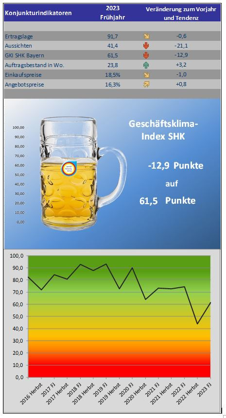 Der SHK-Geschäftsklimaindex für die bayerische SHK-Branche wird vom Fachverband SHK Bayern basierend auf der eigenen Konjunkturumfrage alle 6 Monate ermittelt. Der Stand des Index im Frühling wird immer mit seinem Stand im Frühling des Vorjahres verglichen. Somit werden die saisonalen Schwankungen aufgefangen.