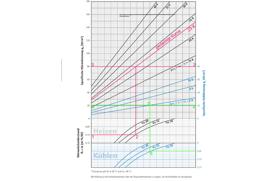 Die Überdeckung der Wandtemperierung soll einen Wärmeleitwiderstand von 0,05 m2K/W nicht überschreiten (Waagerechte durch Punkt 6).