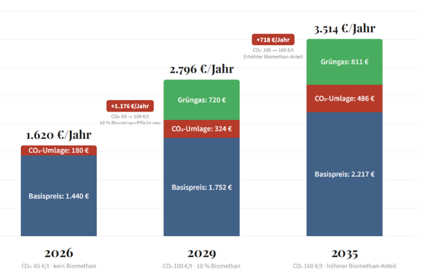 Woher die großen Mengen Bio-Brennstoffe kommen sollen, lässt das Eckpunktepapier genauso offen, wie es die Kosten der „Technologieoffenheit“ nicht klar benennt. Was die Grüngasquote für die Kosten einer Gasheizung bedeutet, hat die Deutsche Sanierungsberatung DSB (siehe Grafiken) errechnet. Die Kosten werden sich durch Grüngasquote, steigende Netzentgelte und CO2-Preise bis 2035 verdoppeln. Die DSB hat hierfür übrigens einen sehr konservativen Anstieg der Netzkosten für Gasnetze angenommen und erwartet, dass die Netzkosten noch deutlich mehr steigen als im Modell angenommen.