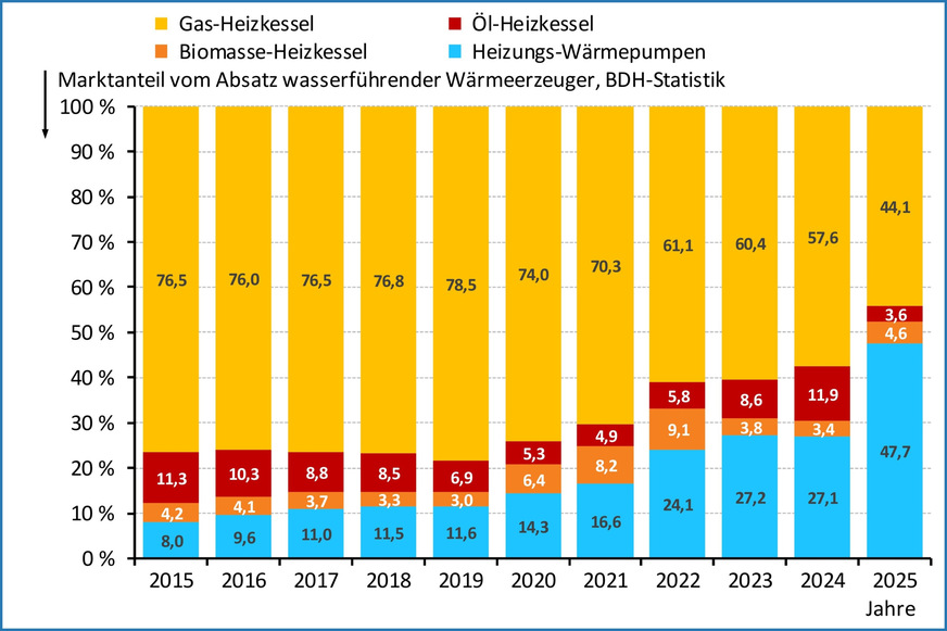 Danach wurden insgesamt 627.000 wasserführende Wärmeerzeuger abgesetzt („an den Handel übergeben“). Den darin enthaltenen Absatz von 299.000 Heizungs-Wärmepumpen mit einem Plus von 55 % hatte bereits am  der Bundesverband Wärmepumpe (BWP) gemeldet und näher aufgeschlüsselt: 2025: Wärmepumpenabsatz steigt um 55 % auf 299.000 Geräte