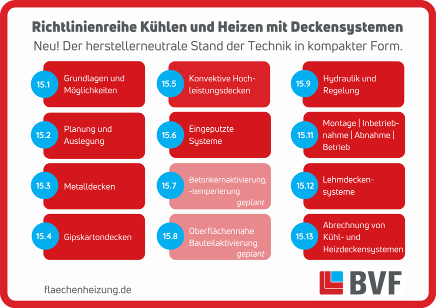 Die Richtlinienreihe Kühl- und Heizdeckensysteme des BVF wird durch diese Richtlinie erweitert. Dabei sind alle Richtlinien aufeinander abgestimmt und sollten gemeinsam genutzt werden.