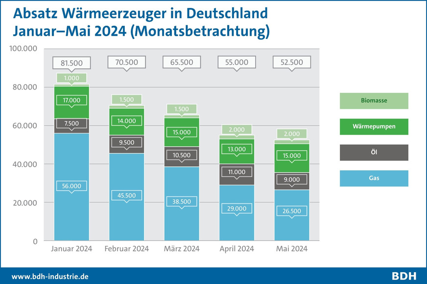 Im Vergleich der ersten fünf 2024er-Monate untereinander ist insbesondere der schwindende Absatz von Gas-Heizungen sichtbar, bei Öl-Heizungen gibt es eine steigende Tendenz, bei Wärmepumpen ist sie relativ stabil und bei Biomasse-Heizungen auf geringem Niveau steigend. Bei Wärmepumpen und Biomasse-Heizungen ist zu erwarten, dass sich das Ankommen der Heizungsförderung im Markt in den kommenden Monaten auch beim Absatz stärker bemerkbar macht.