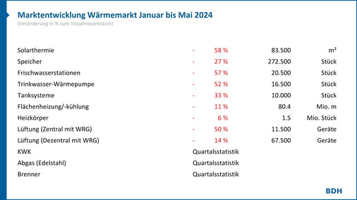Eine negative Marktentwicklung gibt es in den ersten 5 Monaten 2024 auch bei praktisch allen heiztechnischen Systemkomponenten. So setzten die Hersteller 58 % weniger solarthermische Kollektorfläche und 50 % weniger Wohnungslüftungsanlagen mit Wärmerückgewinnung ab. Auch Heizkörper und Fußbodenheizungen verzeichnen Marktrückgänge von 6 % und 11 %.