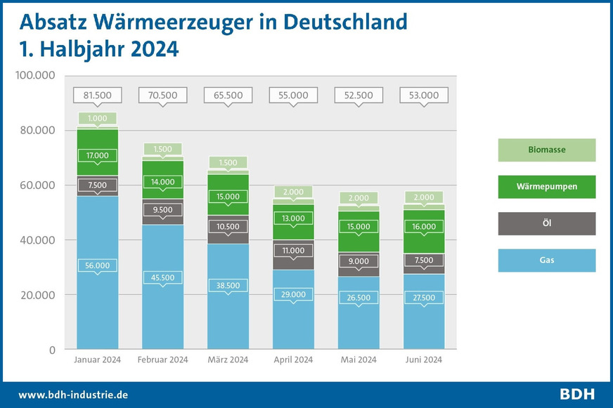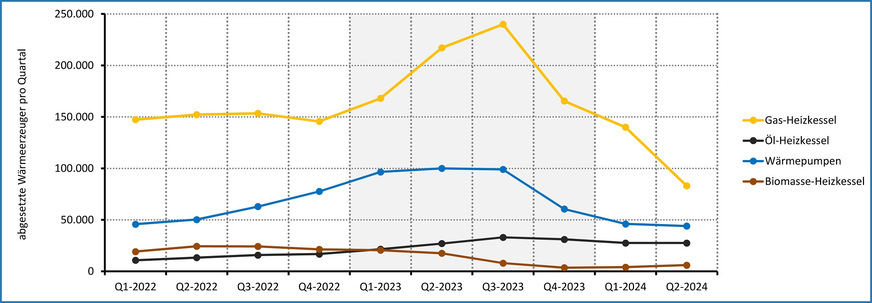 Ein weiterer Absturz war jedoch abzusehen, weil die Rekordwerte 2023 insbesondere mit einem steilen Absatzhochlauf in der Jahresmitte mit einem Hochpunkt bei Gas- und Öl-Heizungen im 3. Quartal einherging. Beispielsweise wurden im Juni 2023 rund 84 000 Gas-Heizungen (Juni 2024: 27 500), etwa 10 000 Öl-Heizungen (Juni 2024: 7000) und ca. 42 500 Wärmepumpen (Juni 2024: 16 000) ausgeliefert.