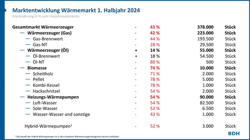 Der Bundesverband der Deutschen Heizungsindustrie (BDH) hat am 29. Juli 2024 die Absatzstatistik für das 1. Halbjahr 2024 vorgelegt. Das zentrale Ergebnis: Die Hersteller setzten 43 % weniger Wärmeerzeuger als im gleichen Zeitraum des Rekordjahres 2023 ab. Noch im Mai 2024 lag der Gesamtabsatz bei einem Minus von 35 %.