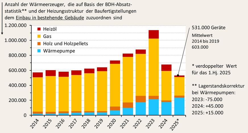 In der nachfolgenden Grafik wurde der Absatz um den Einbau von Wärmeerzeugern in neu errichteten Gebäuden verringert. Hierfür existieren zwar keine scharfen Zahlen, eine gute Annäherung ist jedoch über die Statistik der Baufertigstellungen möglich. Um den im Jahr 2023 aufgebauten Überbestand an Wärmepumpen im Groß- und Einzelhandel zu berücksichtigen, wurden die Absatzzahlen korrigiert und zwar für das Jahr 2023 um minus 75.000 Geräte, für das Jahr 2024 um plus 45.000 Geräte und im Jahr 2025 um plus 15.000 Geräte. Die Korrekturwerte wurden aus unterschiedlichen Daten abgeleitet, offizielle Werte sind nicht bekannt. Für 2025 wurden die Werte des 1. Halbjahres verdoppelt und die Zahlen der Baufertigstellungen aus dem Jahr 2024 fortgeschrieben.