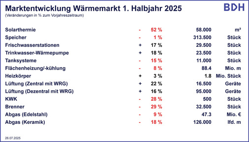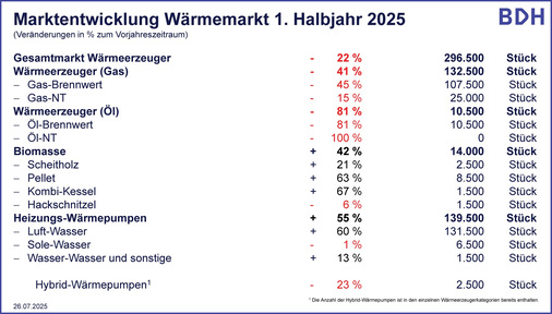 Die Zahlen vom Bundesverband der Deutschen Heizungsindustrie (BDH) entsprechen insbesondere bei kurzen Zeiträumen nicht unbedingt der aktuellen Nachfrage oder Nachfragestimmung, da sie Veränderungen beim Lagerstand im Groß- und Einzelhandel sowie Vor- und Nachlaufzeiten nicht berücksichtigen. Konkret wurden im 1. Halbjahr 2025 (Klammerwerte: Veränderung gegenüber dem Vorjahreszeitraum) abgesetzt: