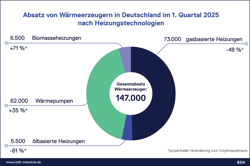 Im 1. Quartal 2025 war der Wärmeerzeugerabsatz um 32 % gegenüber Q1-2024 erneut rückläufig. Wärmepumpen legten um 35 % zu und hatten einen Marktanteil von 42 %.