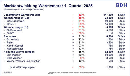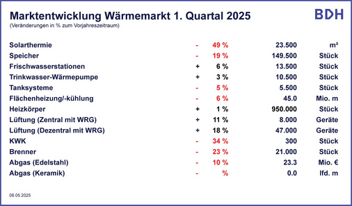 Der Bundesverband der Deutschen Heizungsindustrie (BDH) hat seine Absatzstatistik für das 1. Quartal 2025 vorgelegt. Die Zahlen erfassen sämtliche am Markt verfügbaren heiztechnischen Lösungen und Komponenten.